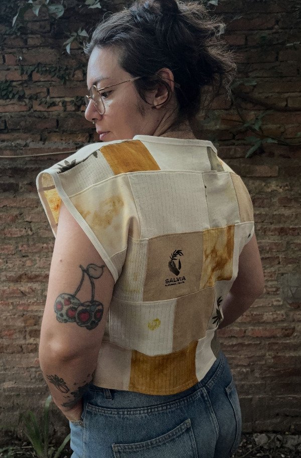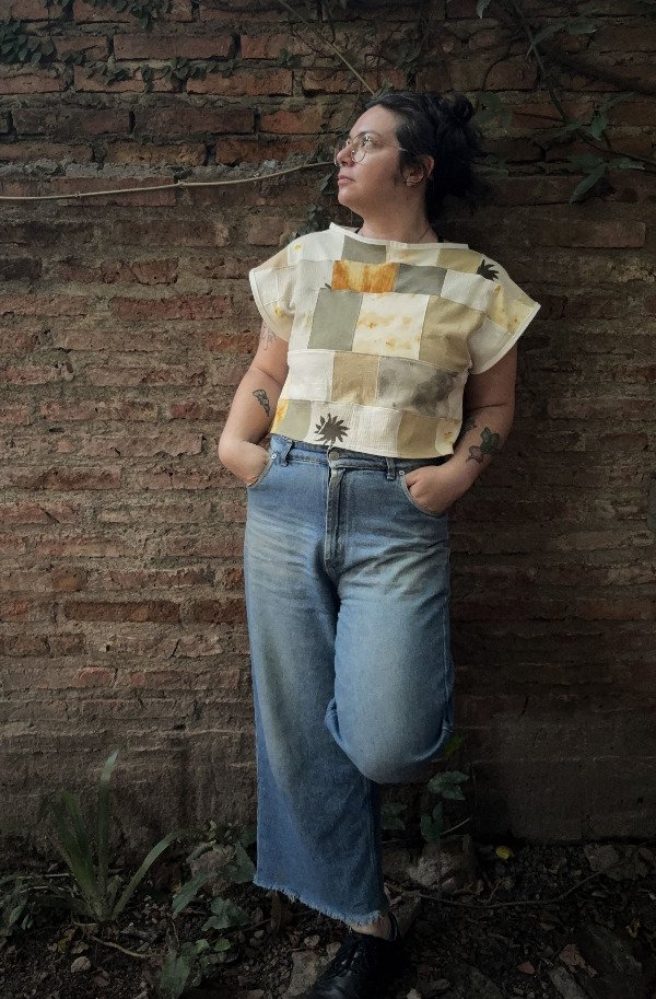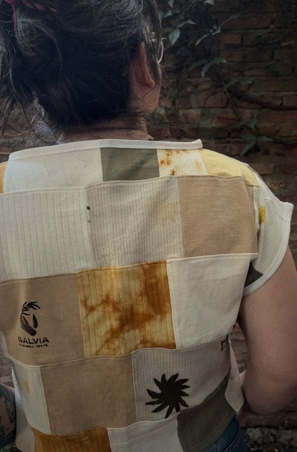 Confeccionada con retazos de algodón natural teñidos artesanalmente con diferentes técnicas de teñido natural y estampa botánica.